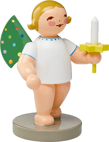 Der Engel mit bunten Flügelpunkten ist ca. 6 cm groß. Die Engel können Sie mit blonden oder braunen Haaren, sowie in den Ausführungen "Kerze in der rechten Hand (rechts)" und "Kerze in der linken Hand (links)" bestellen.