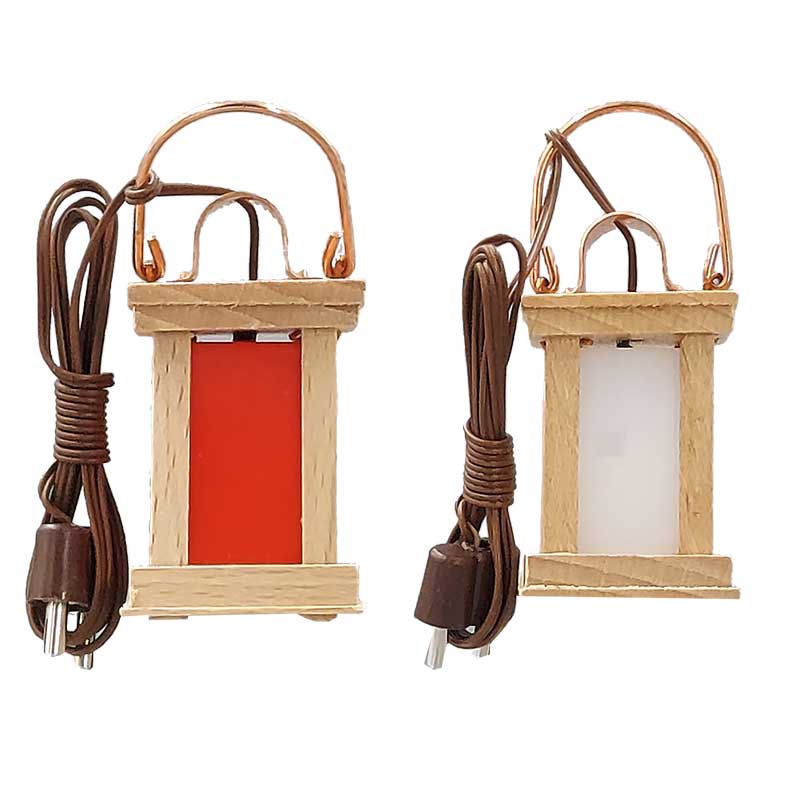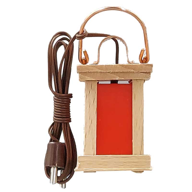 Diese sehr schöne Holzlaterne mit Kupferbügel ist mit ca. 50 cm Kabel, Stecker und LED-Birne fertig montiert.