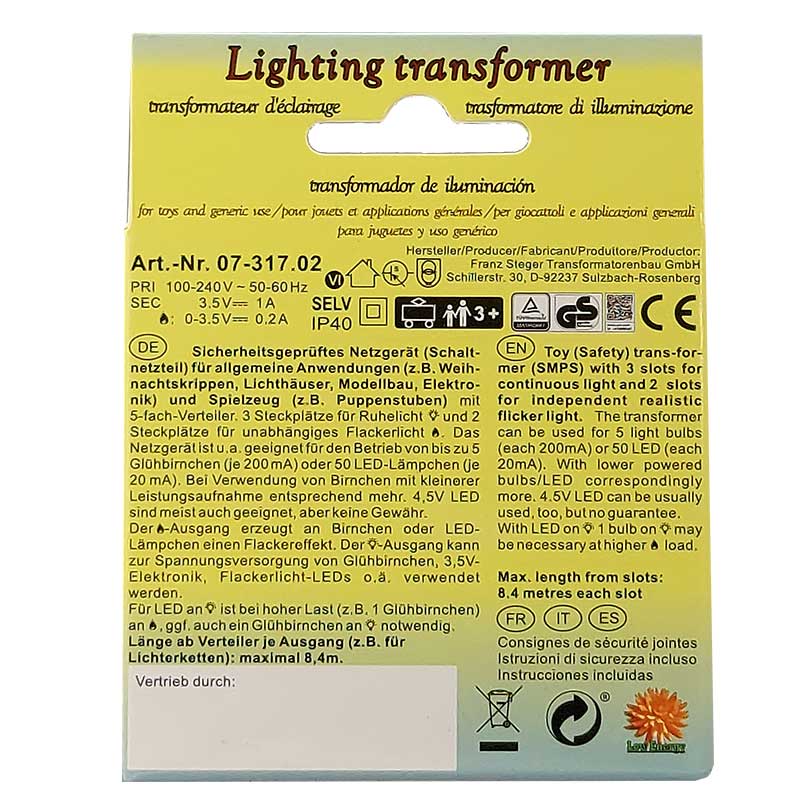 Beleuchtungstrafo für Puppenstuben und Weihnachtskrippen mit 5-fach Verteiler