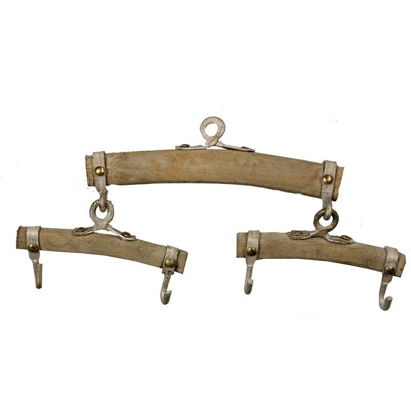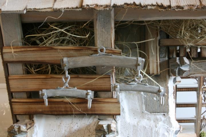 Wagscheit aus Holz mit Metallbeschläge, gebeitzt Waagbalken oder Wagscheit wird das goße Holzstück, an dem die zwei kleineren Ortscheite befestigt sind. Der Waagbalken ist nötig um die Zugkraft der Pferde aufeinander anzupassen.